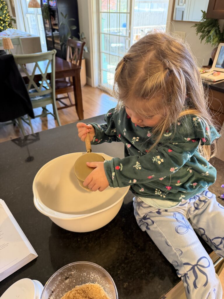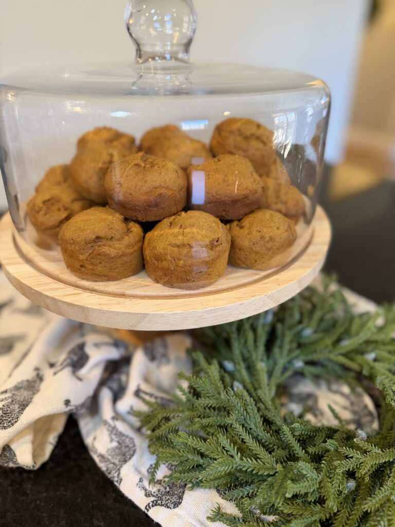 You will, of course, need a couple bowls one for wet ingredients and one for the dry. Depending on if you want to make regular size muffin tins or mini muffins, you will need a muffin pan in whatever size you choose. (if you do mini muffins, just adjust the baking time!) I absolutely LOVE this muffin pan, the muffins come out so easily and the clean up is minimal! I do still spray them with avocado oil so prevent sticking! And to make getting the batter into the muffin pan super easy-peasy, I used this scooper! I also love to display the muffins on a covered cake stand – the girls love eyeing the cake stand full of goodies after school when they run into the house!